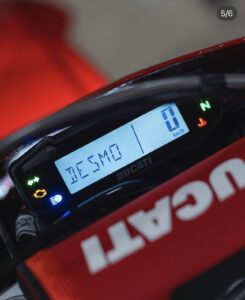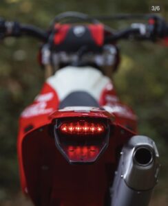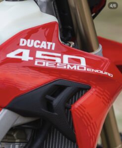 - Adaptações para Enduro: Diferente da versão MX, a Desmo450 Enduro possui um tanque de combustível maior (8,5 litros), roda traseira de 18 polegadas, protetores de mão e cavalete lateral.